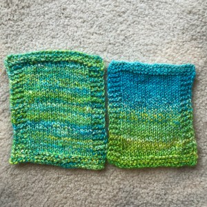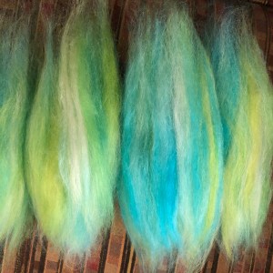 The yarn on the left is from the blended preparation. It is much more heathery. Ideally, I would have liked to run it through a drum carder and spin from lengthwise strips from the batt. The yarn on the right maintains it’s color integrity better because it is spun as it is dyed and the direction of spinning and plying is carefully maintained.