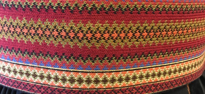 It was so special to go to a shop where there were people actually working by hand with needle and thread. Applique, buttonholes, intricate pleating, embroidery and such. You could tell that these women do it for love. It is more than just a job. Arnhild showed them a band I wove for her using sewing thread–a miniature of the center piece of her bunad belt. The shop ladies gathered around and wanted to feel it. They then pronounced that I would be just fine weaving my brikkeband (card weaving in Norwegian). Made me feel good. At left is a photo of my band and below photos of their working space in the shop. Working here would be almost as good as working at the museum.